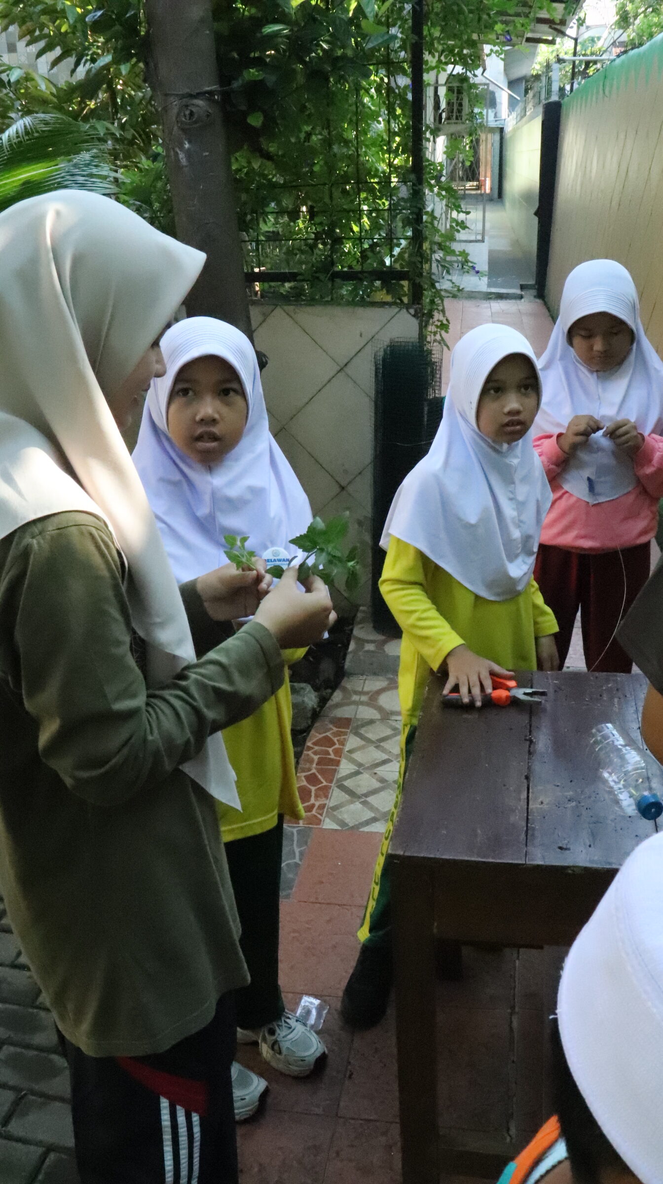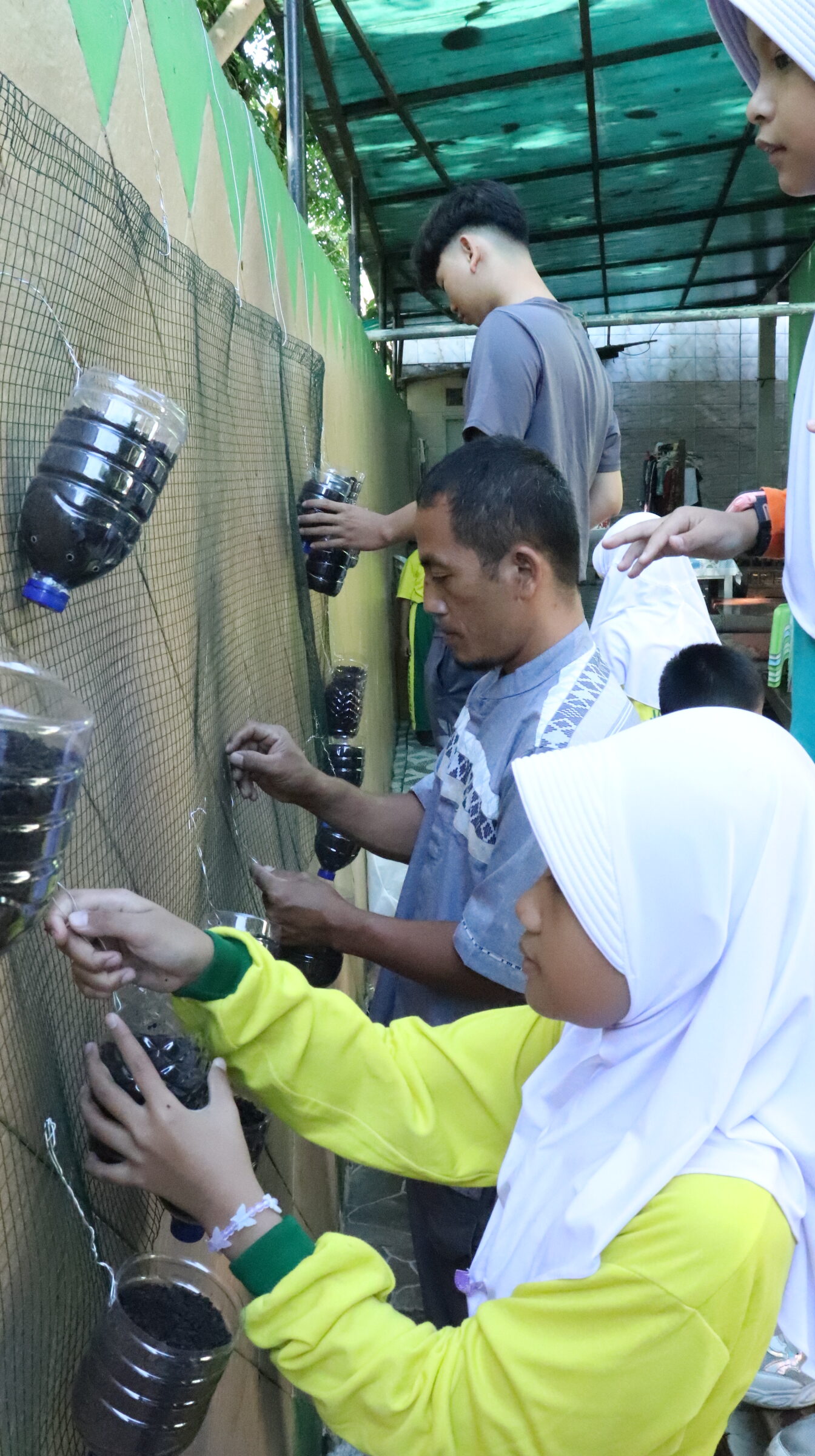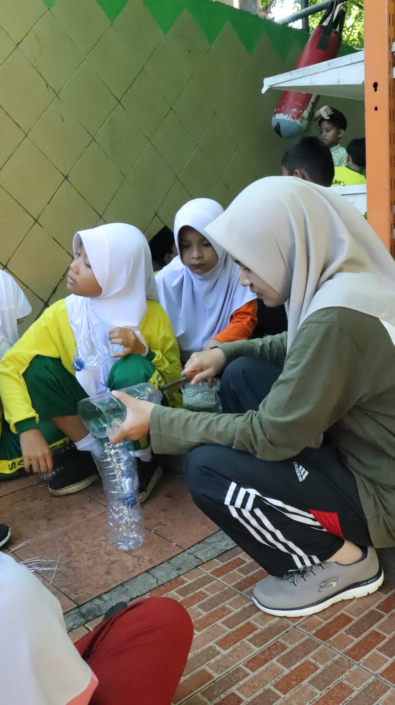 Setelah itu, kegiatan dilanjutkan dengan pembuatan pot sederhana dari botol plastik bekas. Siswa-siswi dengan bimbingan guru melubangi botol menggunakan alat khusus agar bisa digunakan sebagai wadah tanaman. Kegiatan ini juga mengajarkan kepada anak-anak bagaimana cara memanfaatkan kembali barang bekas (daur ulang) sehingga memiliki nilai guna dan tidak menjadi sampah yang mencemari lingkungan.