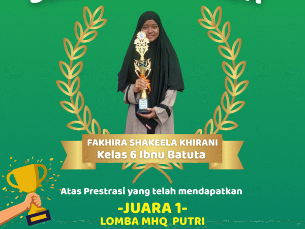 Penghargaan PrestasiDengan penuh rasa syukur, kami mengucapkan selamat kepada Fakhira Shakeela Khirani, siswi kelas 6 Ibnu Batuta, yang berhasil meraih Juara 1 Musabaqah Hifdzil Qur’an (MHQ) Putri pada ajang Pentas..